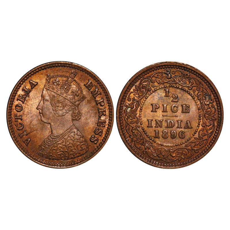 Victoria Empress, Copper, 1/2 Pice, 1896, Calcutta Mint, A/I, No mint mark, Die cracks on Obv. F. Prid 729. GK 876. Extremely Fine+. Scarce.