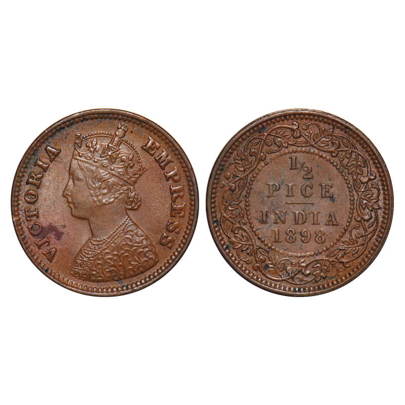 Victoria Empress, Copper, 1/2 Pice, 1898, Calcutta Mint, A/I, No mint mark, die cracks on Obv. F. Prid 731. GK 878. Uncirculated. Very Scarce.