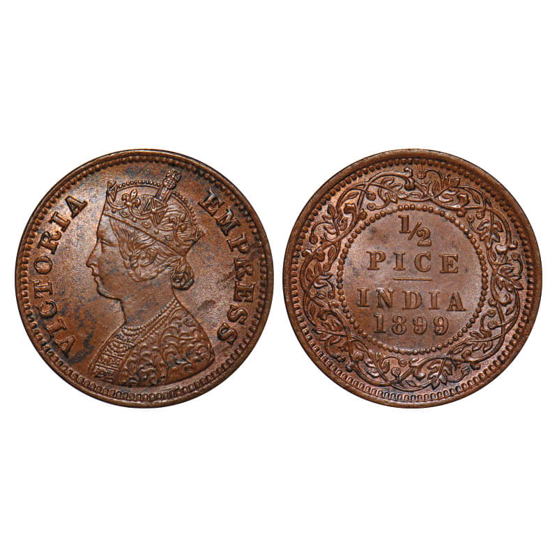 Victoria Empress, Copper, 1/2 Pice, 1899, Calcutta Mint, A/I, No mint mark. F. Prid 732. GK 879. Brilliant Uncirculated. Rare.