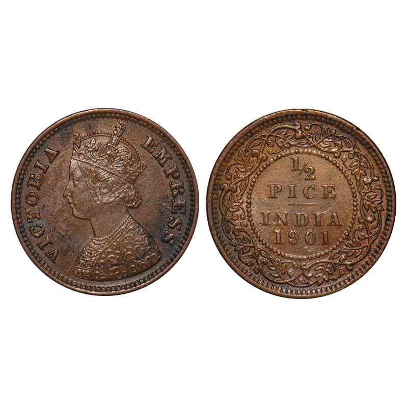Victoria Empress, Copper, 1/2 Pice, 1901, Calcutta Mint, A/I, No mint mark, Die cracks on Obv. F. Prid 734. GK 881. Almost Uncirculated. Very Scarce.