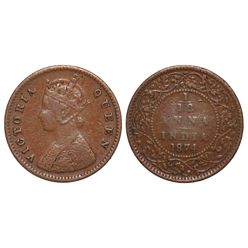Victoria Queen, Copper, 1/12 Anna, 1874, Calcutta Mint, Obv A, No mint mark. F. Prid 783. GK 882. Fine+. Rare.
