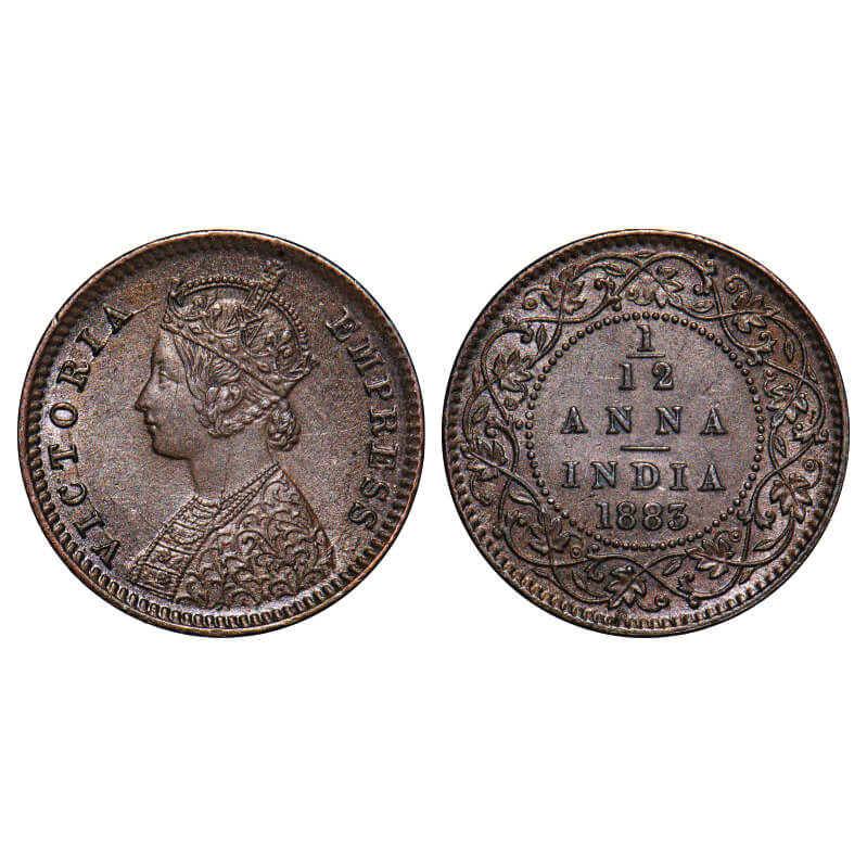 Victoria Empress, Copper, 1/12 Anna, 1883, Calcutta Mint, Obv B, 'C' incused. F. Prid 789. GK 896. Almost Uncirculated. Very Scarce.