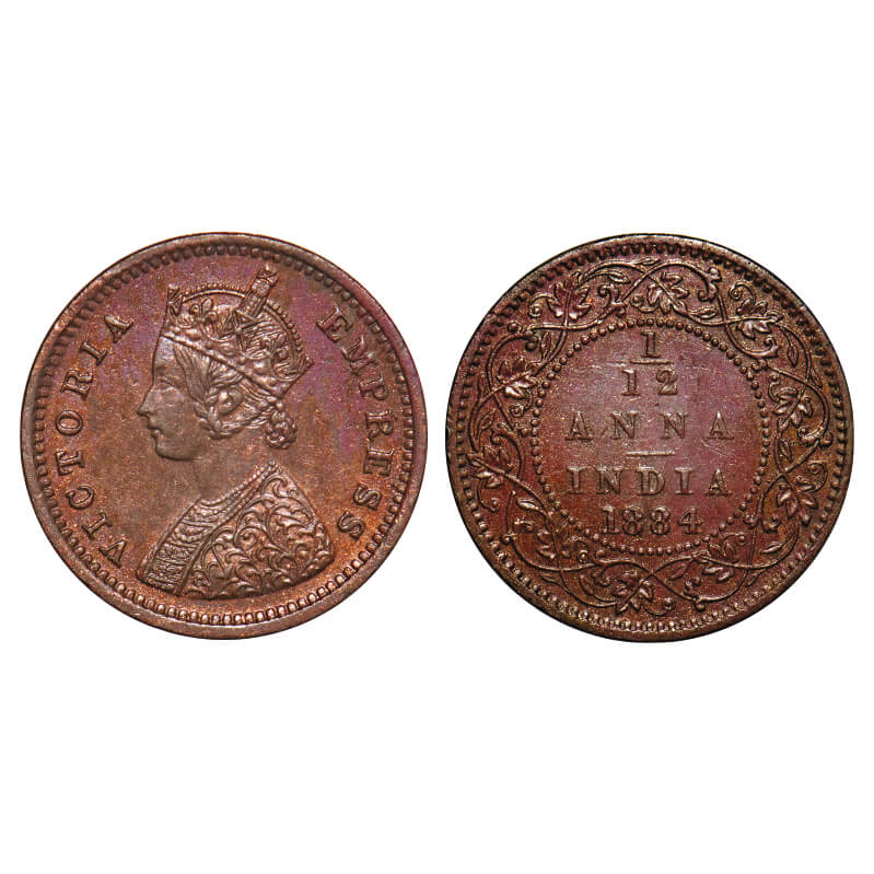 Victoria Empress, Copper, 1/12 Anna, 1884, Bombay Mint, Obv A, No mint mark. F. Prid 812. GK 898. Extremely Fine. Very Scarce.