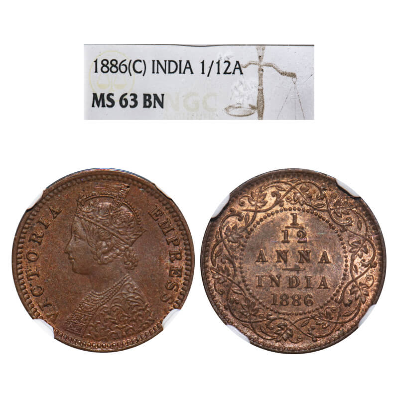 Victoria Empress, Copper, 1/12 Anna, 1886, Calcutta Mint, Obv B, 'C' incused. F. Prid 791. GK 902. NGC Slab MS 63 BN. Very Rare.