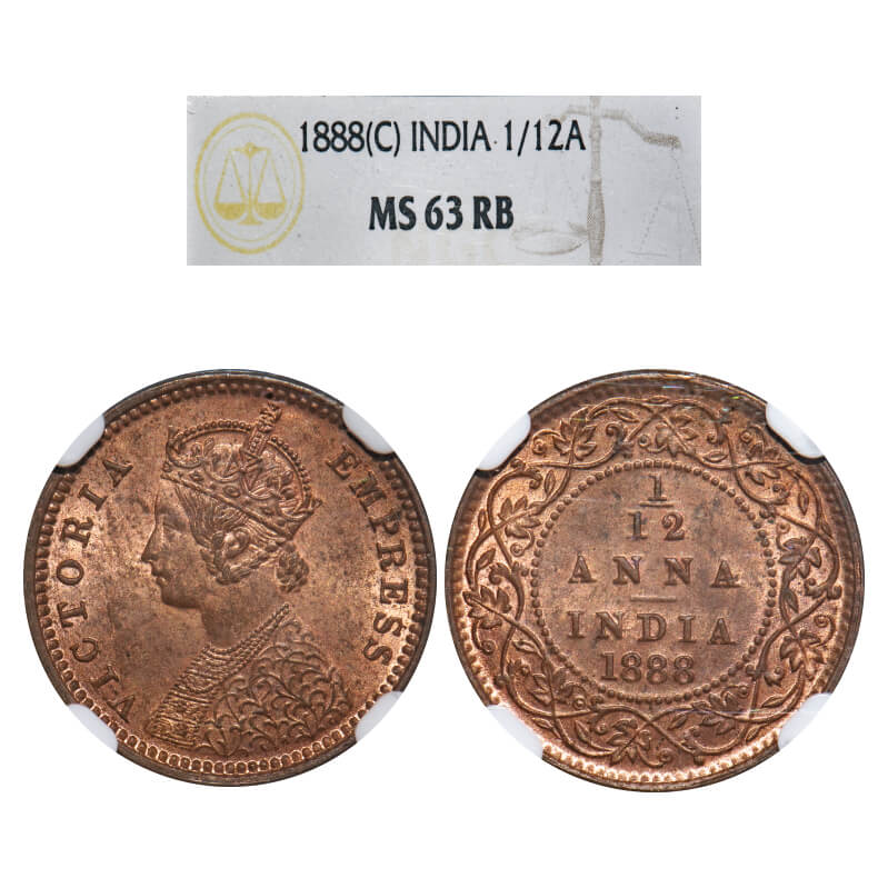 Victoria Empress, Copper, 1/12 Anna, 1888, Calcutta Mint, Obv B, No mint mark. F. Prid 793. GK 908. NGC Slab MS 63 RB. Very Rare.