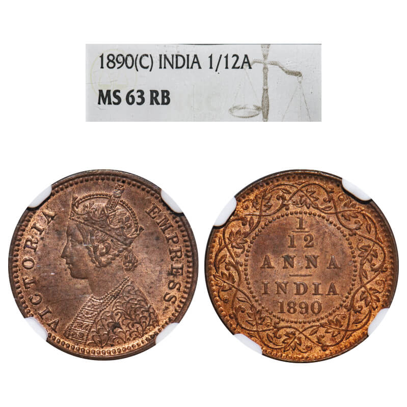 Victoria Empress, Copper, 1/12 Anna, 1890, Calcutta Mint, Obv B, No mint mark. F. Prid 795. GK 911. NGC Slab MS 63 RB. Rare.