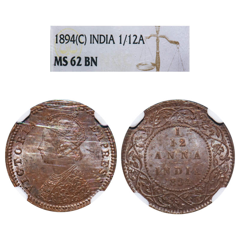Victoria Empress, Copper, 1/12 Anna, 1894, Calcutta Mint, Obv B, No mint mark. F. Prid 799. GK 915. NGC Slab MS 62 BN. Rare.