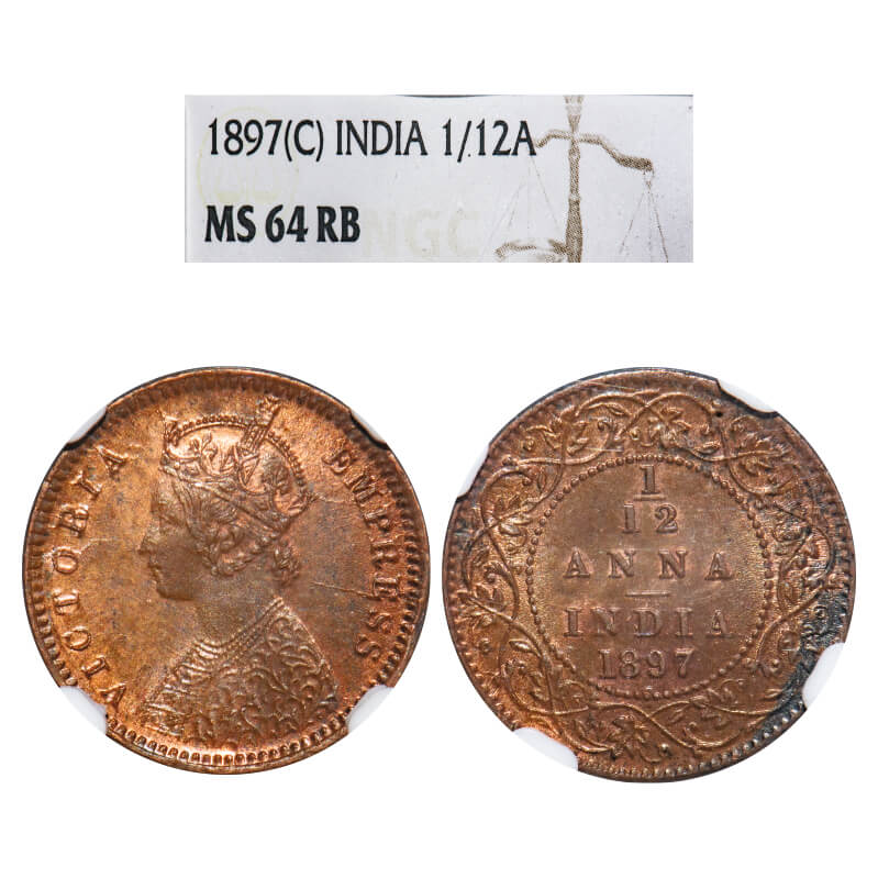Victoria Empress, Copper, 1/12 Anna, 1897, Calcutta Mint, Obv B, No mint mark. F. Prid 802. GK 918. NGC Slab MS 64 RB. Very Rare.
