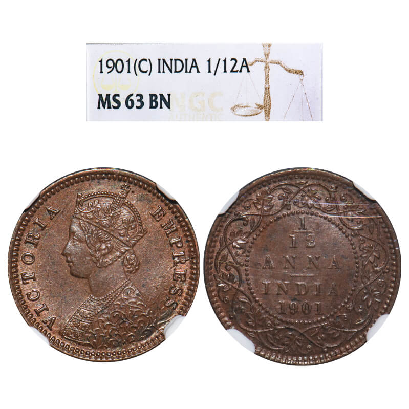Victoria Empress, Copper, 1/12 Anna, 1901, Calcutta Mint, Obv B, No mint mark. F. Prid 805. GK 921. NGC Slab MS 63 BN. Very Rare.