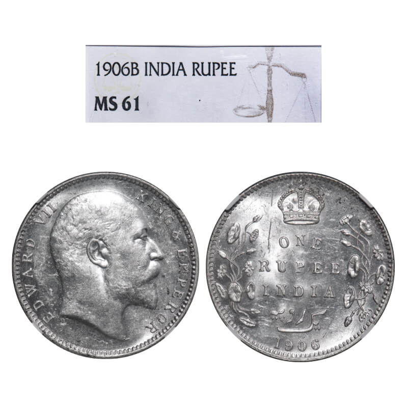 Edward VII, Silver, Rupee, 1906, Bombay Mint, 'B' incused and dot. F. Prid 202. GK 940. NGC Slab MS 61. Rare.