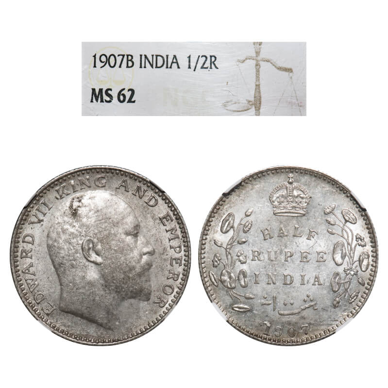 Edward VII, Silver, Half Rupee, 1907, Bombay Mint, 'B' incused and dot. F. Prid 316. GK 965. NGC Slab MS 62. Very Rare.