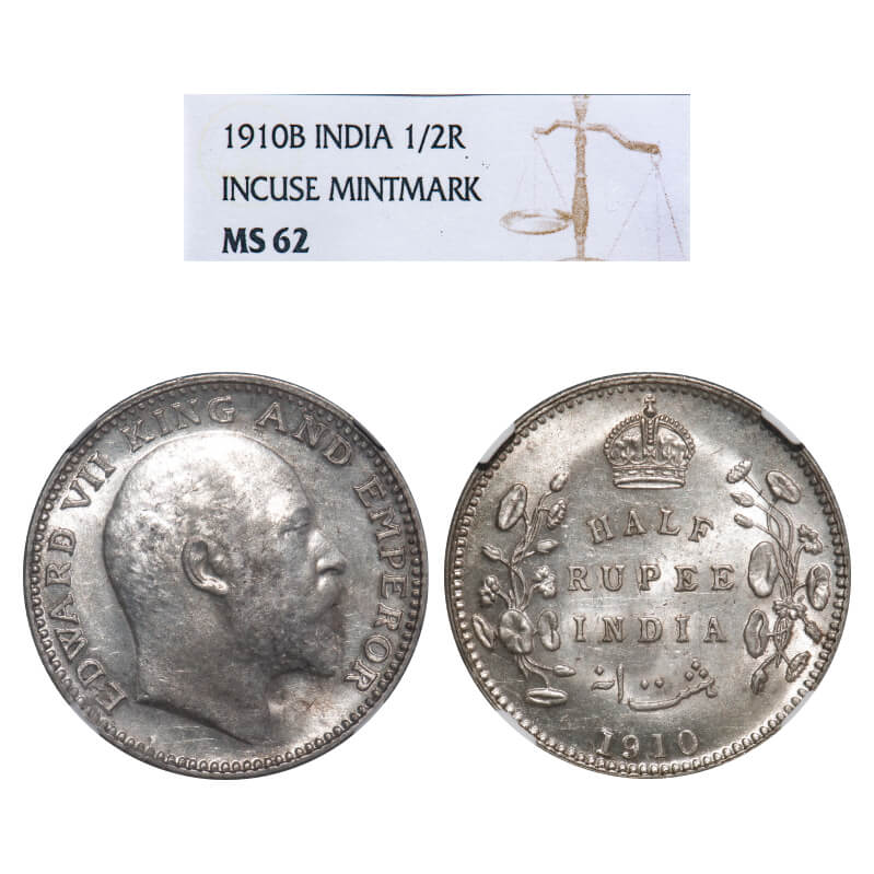 Edward VII, Silver, Half Rupee, 1910, Bombay Mint, 'B' incused and dot. F. Prid 317. GK 970. NGC Slab MS 62. Extremely Rare.