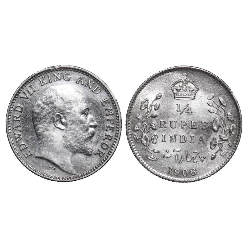 Edward VII, Silver, 1/4 Rupee, 1906, Calcutta Mint, No mint mark. F. Prid 435. GK 975. Almost Uncirculated. Very Scarce.