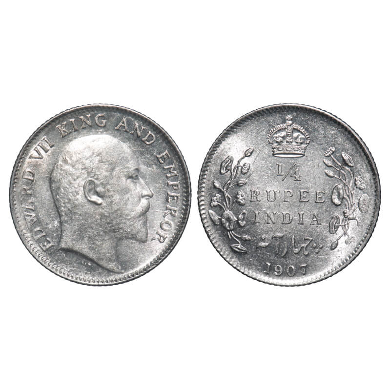 Edward VII, Silver, 1/4 Rupee, 1907, Calcutta Mint, No mint mark. F. Prid 436. GK 976. Brilliant Uncirculated. Rare.