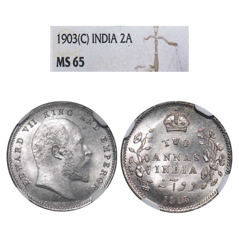 Edward VII, Silver, 2 Annas, 1903, Calcutta Mint, No mint mark. F. Prid 556. GK 980. NGC Slab MS 65. Very Rare. (In NGC 4 coins are graded higher then MS 65 and non in PCGS, Till date)