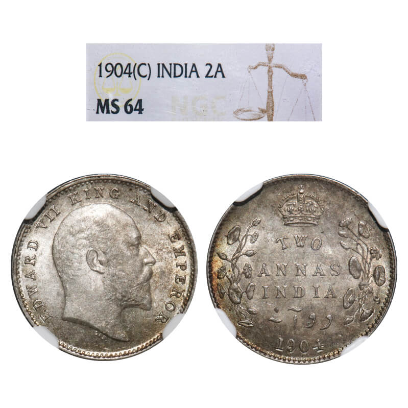 Edward VII, Silver, 2 Annas, 1904, Calcutta Mint, No mint mark. F. Prid 557. GK 981. NGC Slab MS 64. Rare.