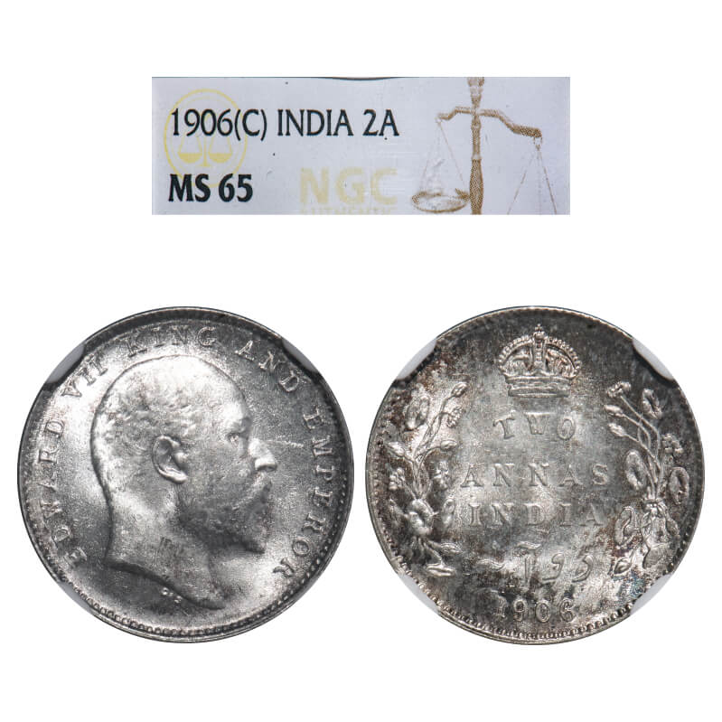 Edward VII, Silver, 2 Annas, 1906, Calcutta Mint, No mint mark. F. Prid 559. GK 983. NGC Slab MS 65. Very Rare. (In NGC 4 coins are graded higher then MS 65 and in PCGS 12 coins are graded higher then MS 65, Till date)