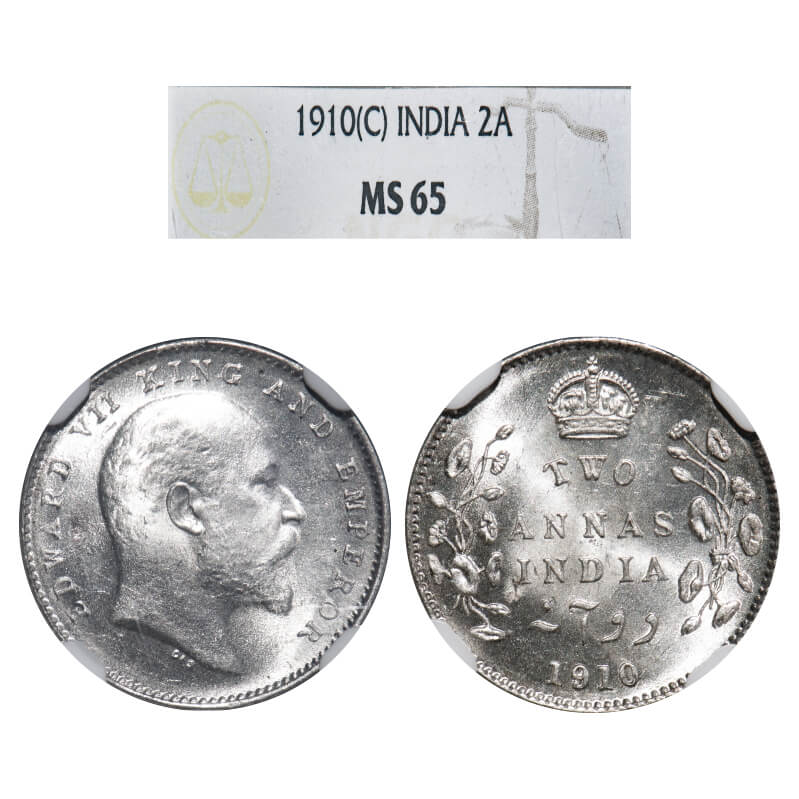 Edward VII, Silver, 2 Annas, 1910, Calcutta Mint, No mint mark. F. Prid 563. GK 987. NGC Slab MS 65. Very Rare.