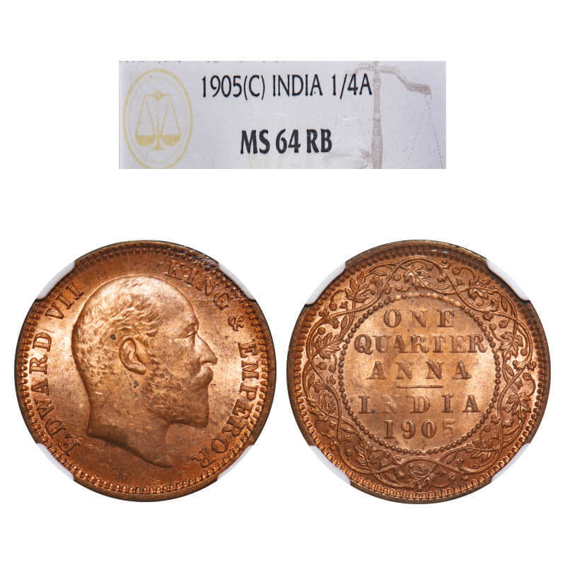 Edward VII, Copper, Quarter Anna, 1905, Calcutta Mint, No mint mark. F. Prid 649. GK 996. NGC Slab MS 64 RB. Very Rare. (In NGC 2 coins are graded higher then MS 64 RB while non in PCGS, Till date)