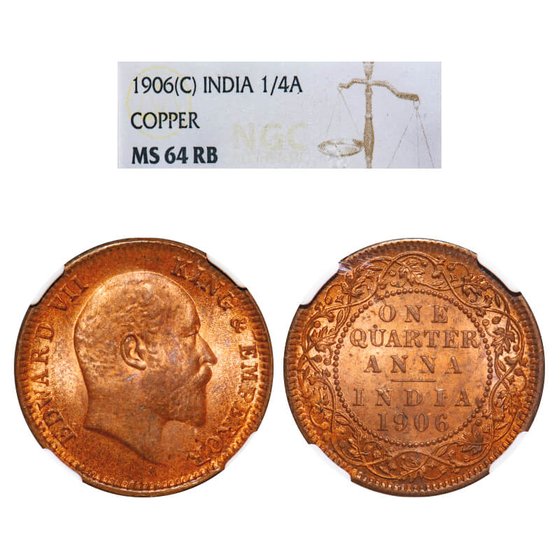 Edward VII, Copper, Quarter Anna, 1906, Calcutta Mint, No mint mark. F. Prid 650. GK 997. NGC Slab MS 64 RB. Very Rare.