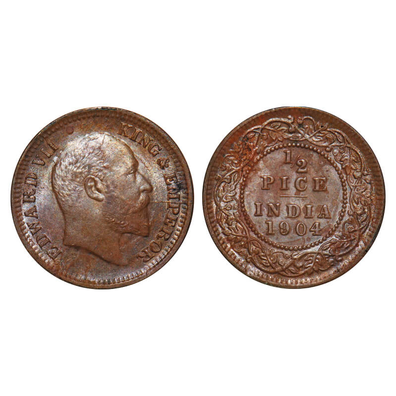 Edward VII, Copper, Half Pice, 1904, Calcutta Mint, No mint mark, Multiple die cracks on Obv, Broken letters 'R' & 2nd 'D' in Edward. F. Prid 736. GK 1004. Uncirculated. Rare.