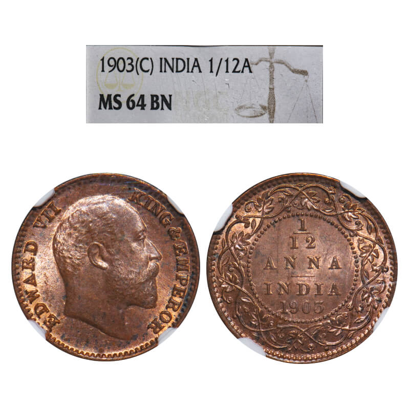 Edward VII, Copper, 1/12 Anna, 1903, Calcutta mInt, No mint mark. F. Prid 818. GK 1012. NGC Slab MS 64 BN. Very Rare. (In NGC & PCGS only one coin is graded higher then MS 64 BN, Till date)
