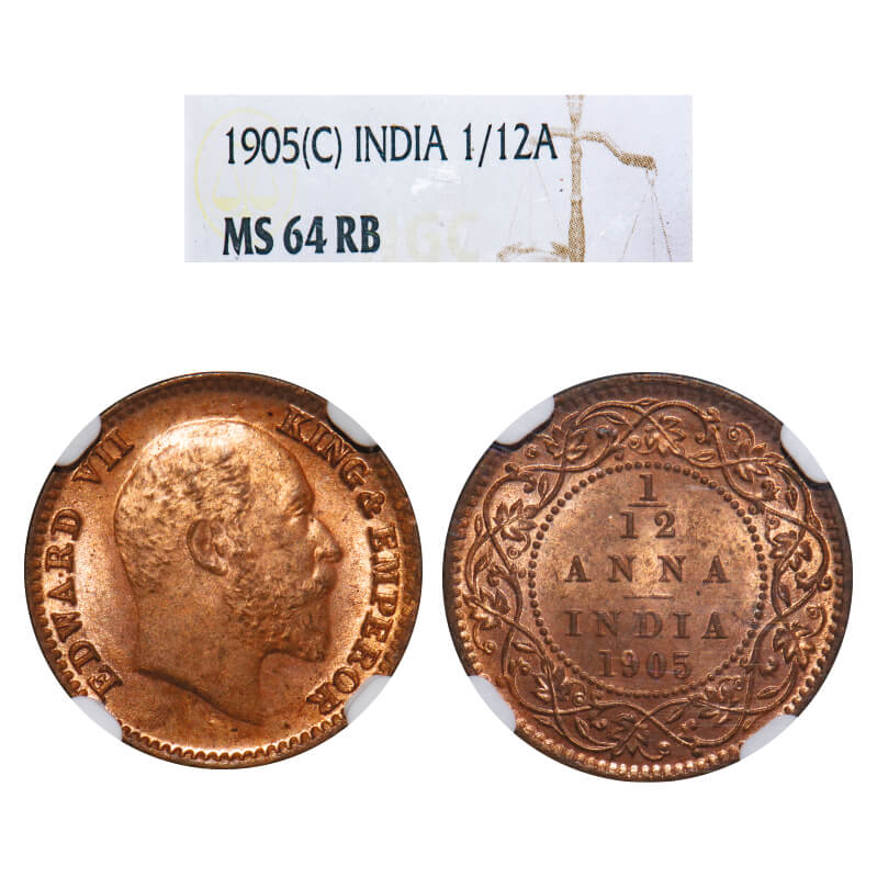 Edward VII, Copper, 1/12 Anna, 1905, Calcutta mInt, No mint mark. F. Prid 820. GK 1014. NGC Slab MS 64 RB. Very Rare.