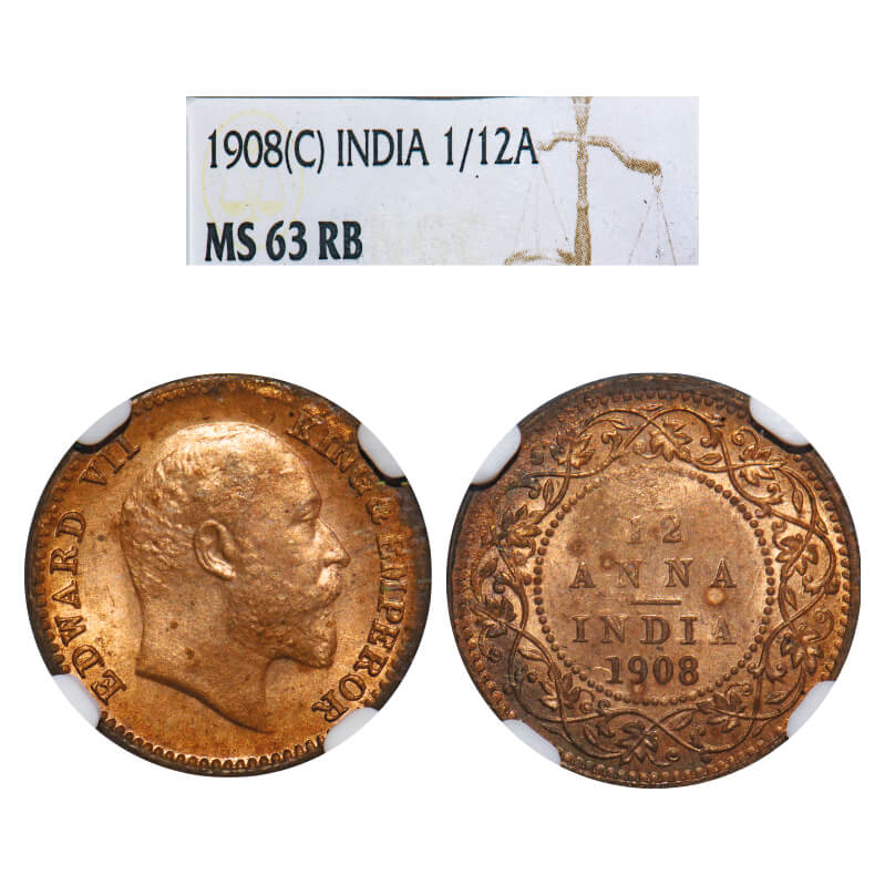 Edward VII, Bronze, 1/12 Anna, 1908, Calcutta Mint, No mint mark. F. Prid 824. GK 1018. NGC Slab MS 63 RB. Rare.