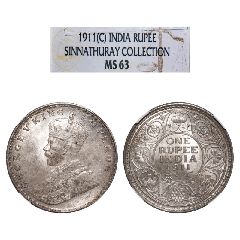 George V, Silver, Rupee, 1911, Calcutta Mint, No dot, Pig-Type. F. Prid 207. GK 1021. NGC Slab MS 63. Extremely Rare.