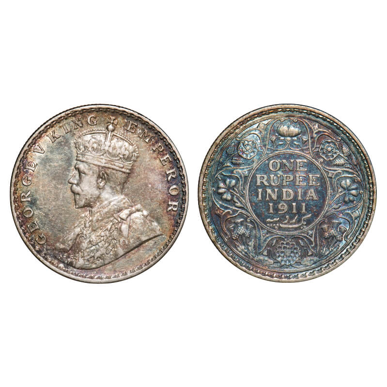 | George V, Silver, Rupee, 1911, Bombay Mint, Dot, Pig-Type, Raised initials 'BM' (Bertram MacKennal) seen on the truncation of Kings shoulder. F. Prid 217. GK 1022. Uncirculated, Rainbow Toned. Very Scarce. |
