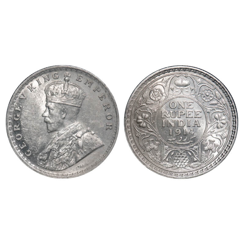 George V, Silver, Rupee, 1914, Calcutta Mint, No dot. F. Prid 210. GK 1029. Almost Uncirculated. Very Scarce.