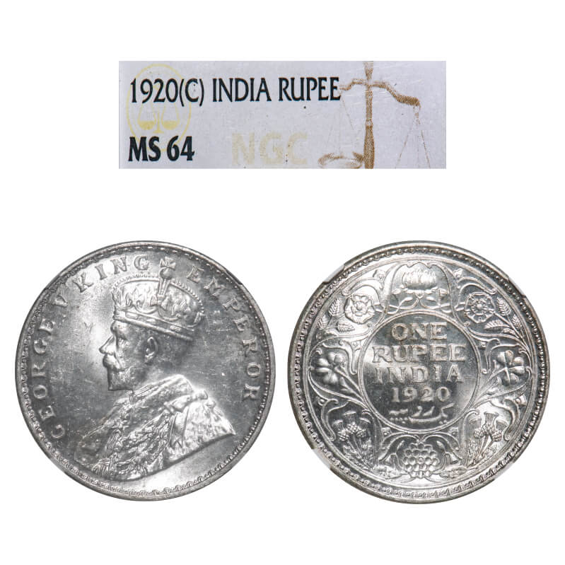 George V, Silver, Rupee, 1920, Calcutta Mint, No dot. F. Prid 216. GK 1041. NGC Slab MS 64. Rare.