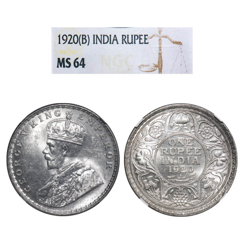George V, Silver, Rupee, 1920, Bombay Mint, Dot. F. Prid 226. GK 1042. NGC Slab MS 64. Extremely Rare.