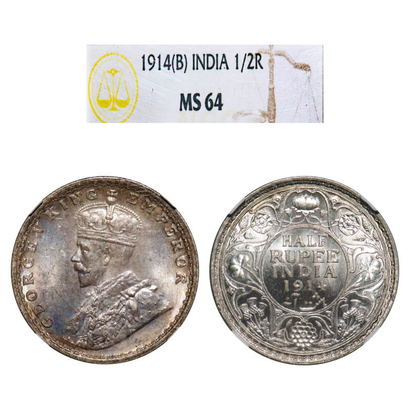 George V, Silver, Half Rupee, 1914, Bombay Mint, Dot. F. Prid 338. GK 1051. NGC Slab MS 64. Very Rare.
