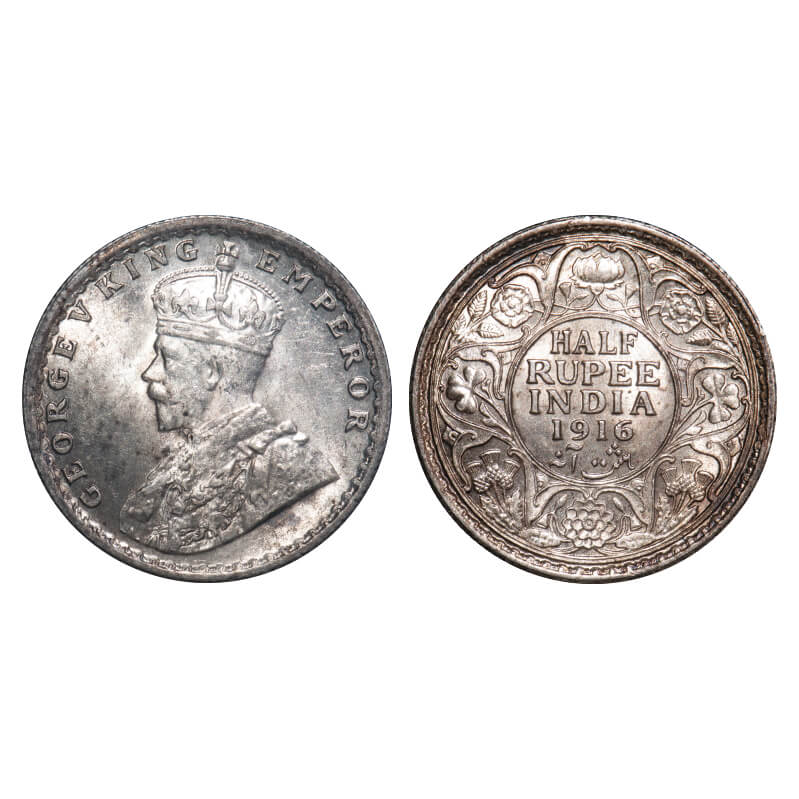 George V, Silver, Half Rupee, 1916, Calcutta Mint, No dot. F. Prid 323. GK 1053. About Uncirculated. Very Scarce.