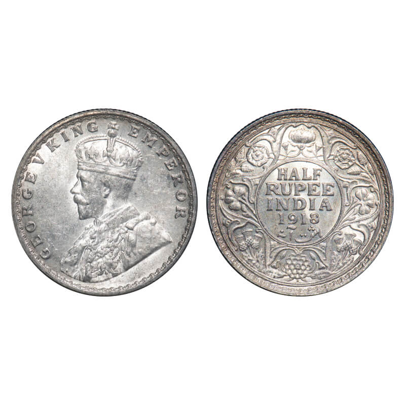 George V, Silver, Half Rupee, 1918, Bombay Mint, Dot. F. Prid 342. GK 1056. Uncirculated. Very Scarce.