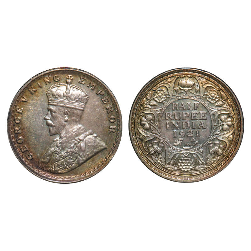 George V, Silver, Half Rupee, 1921, Calcutta Mint, No dot. F. Prid 324. GK 1058. Uncirculated, Toned. Very Scarce.