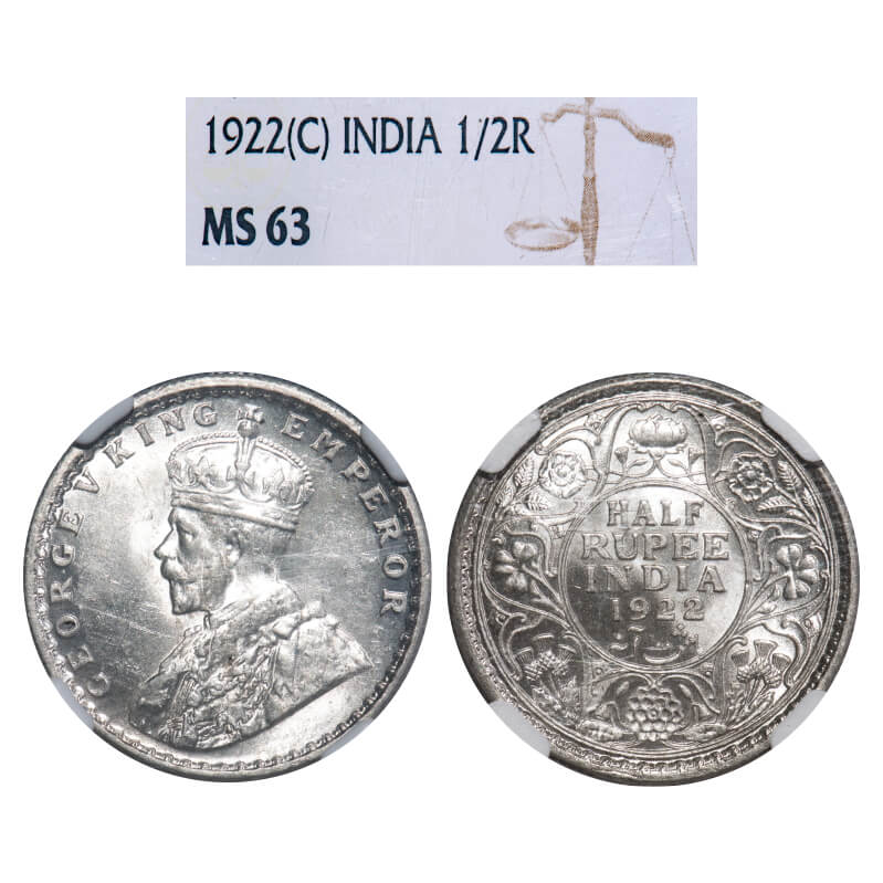 George V, Silver, Half Rupee, 1922, Calcutta Mint, No dot. F. Prid 325. GK 1059. NGC Slab MS 63. Very Rare.