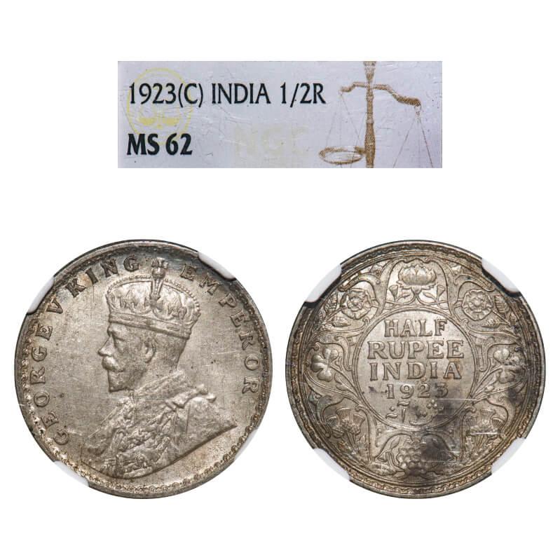 George V, Silver, Half Rupee, 1923, Calcutta Mint, No dot. F. Prid 326. GK 1061. NGC Slab MS 62. Rare.