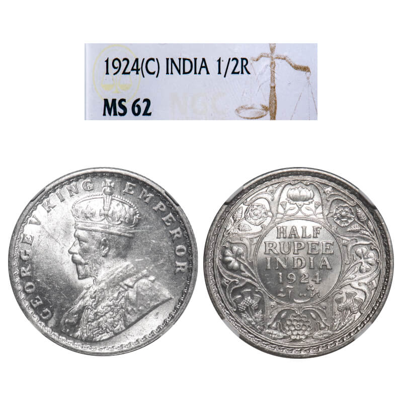 George V, Silver, Half Rupee, 1924, Calcutta Mint, No dot. F. Prid 327. GK 1063. NGC Slab MS 62. Rare.