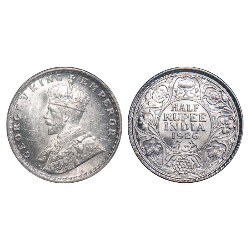 George V, Silver, Half Rupee, 1926, Calcutta Mint, No dot. F. Prid 329. GK 1067. Uncirculated. Rare.