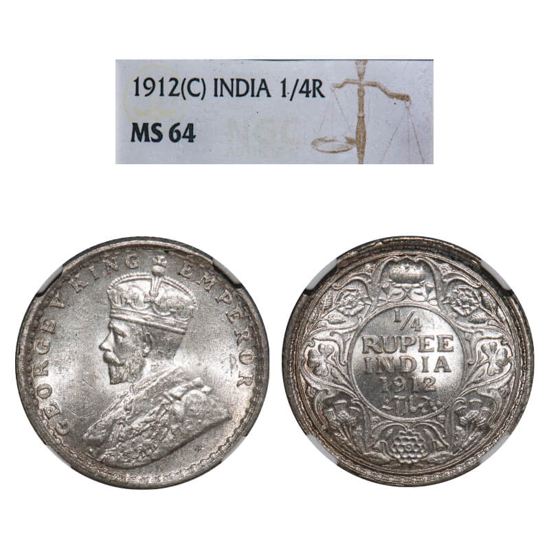 George V, Silver, 1/4 Rupee, 1912, Calcutta Mint, No dot, Re-drawn Elephant. F. Prid 441. GK 1081. NGC Slab MS 64. Very Rare. (In NGC 6 coins are graded higher then MS 64 and in PCGS non are graded higher then MS 64, Till date)