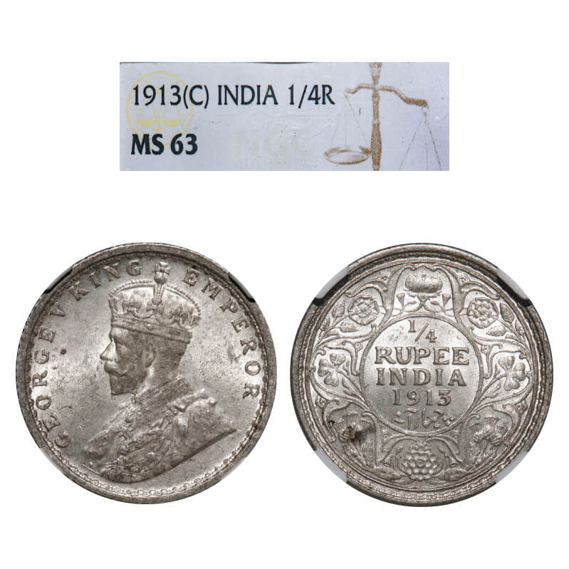 George V, Silver, 1/4 Rupee, 1913, Calcutta Mint, No dot, Elephant. F. Prid 442. GK 1083. NGC Slab MS 63. Rare.