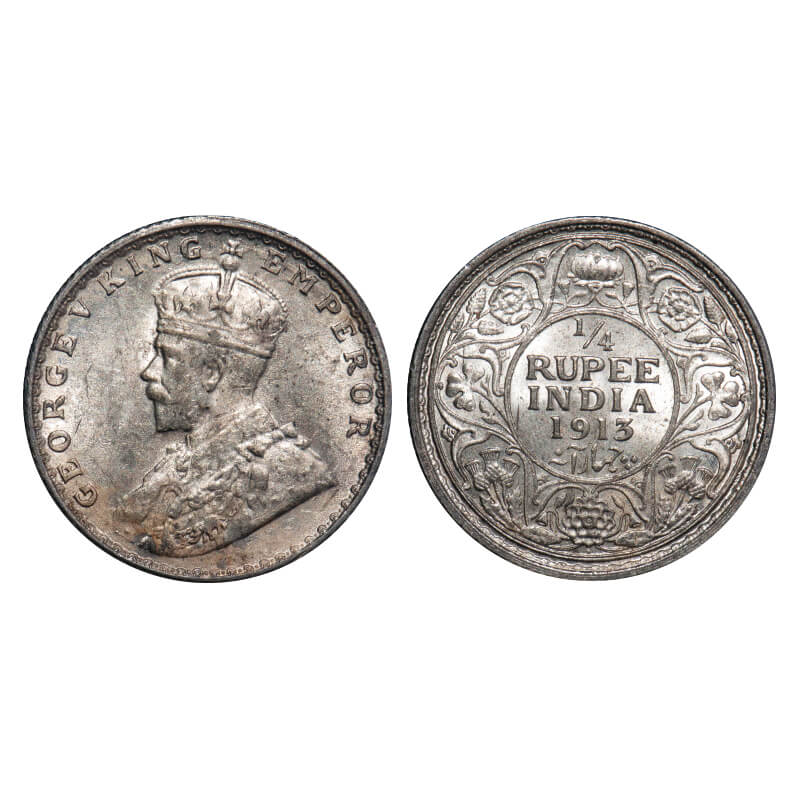 George V, Silver, 1/4 Rupee, 1913, Bombay Mint, Dot, Elephant. F. Prid 455. GK 1084. About Uncirculated. Very Scarce.