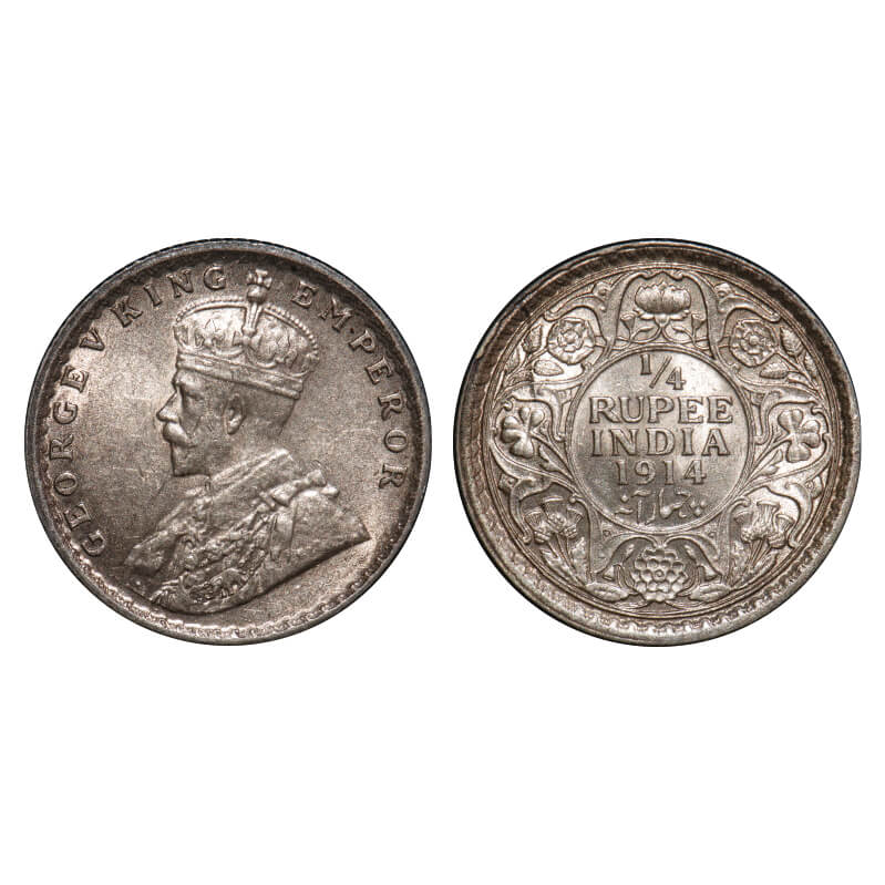 George V, Silver, 1/4 Rupee, 1914, Calcutta Mint, No dot, Elephant. F. Prid 443. GK 1085. Uncirculated. Very Scarce.