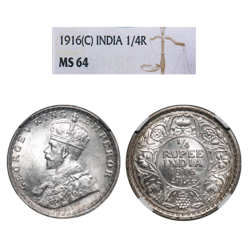 George V, Silver, 1/4 Rupee, 1916, Calcutta Mint, No dot. F. Prid 445. GK 1089. NGC Slab MS 64. Extremely Rare. (In NGC 6 coins are graded higher then MS 64 and in PCGS non are graded higher then MS 64, Till date)