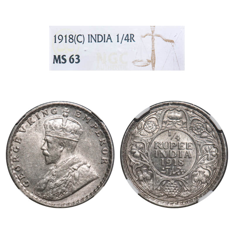 George V, Silver, 1/4 Rupee, 1918, Calcutta Mint, No dot. F. Prid 447. GK 1091. NGC Slab MS 63. Rare.