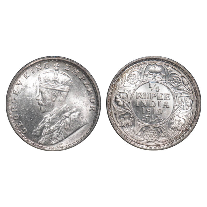 George V, Silver, 1/4 Rupee, 1919, Calcutta Mint, No dot. F. Prid 448. GK 1092. Mint State. Rare.