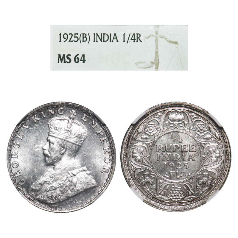 George V, Silver, 1/4 Rupee, 1925, Bombay Mint, Dot. F. Prid 458. GK 1093. NGC Slab MS 64. Rare.