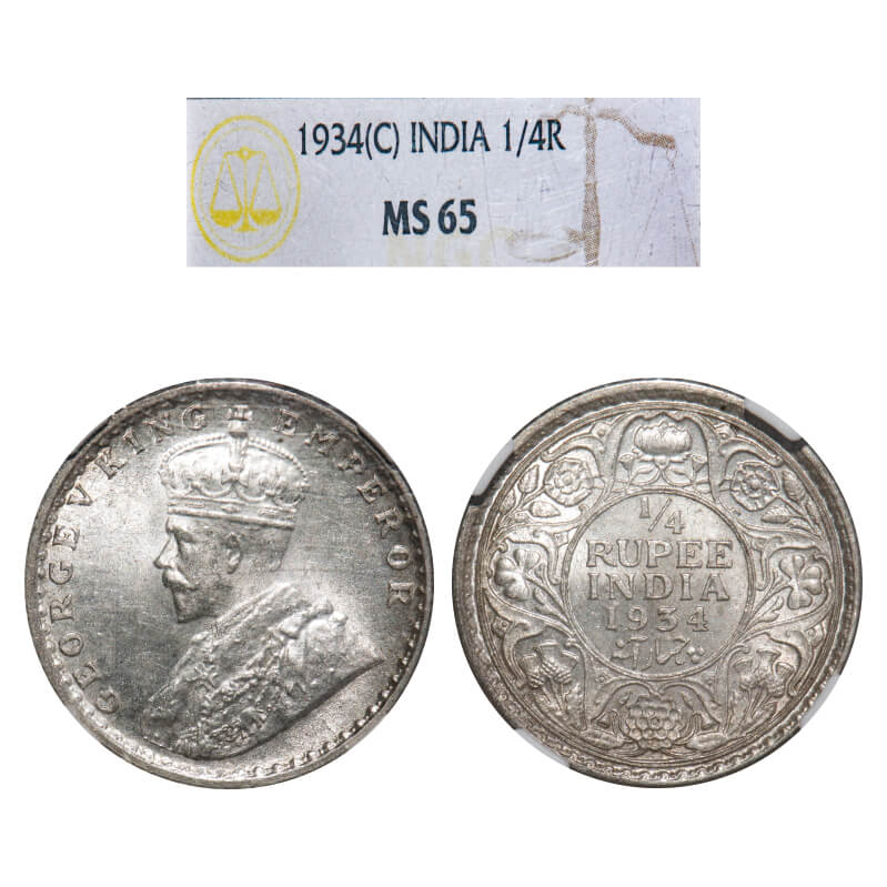 George V, Silver, 1/4 Rupee, 1934, Calcutta Mint, No dot. F. Prid 452. GK 1098. NGC Slab MS 65. Extremely Rare. (In NGC and PCGS 3 coins are graded higher then MS 65, Till date)
